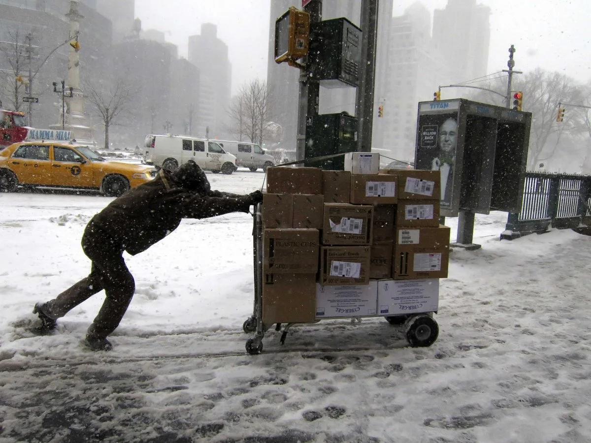 UPS delivery person pushing a cart of packages through the snow. Photo source: Business Insider article of seasonal employees.