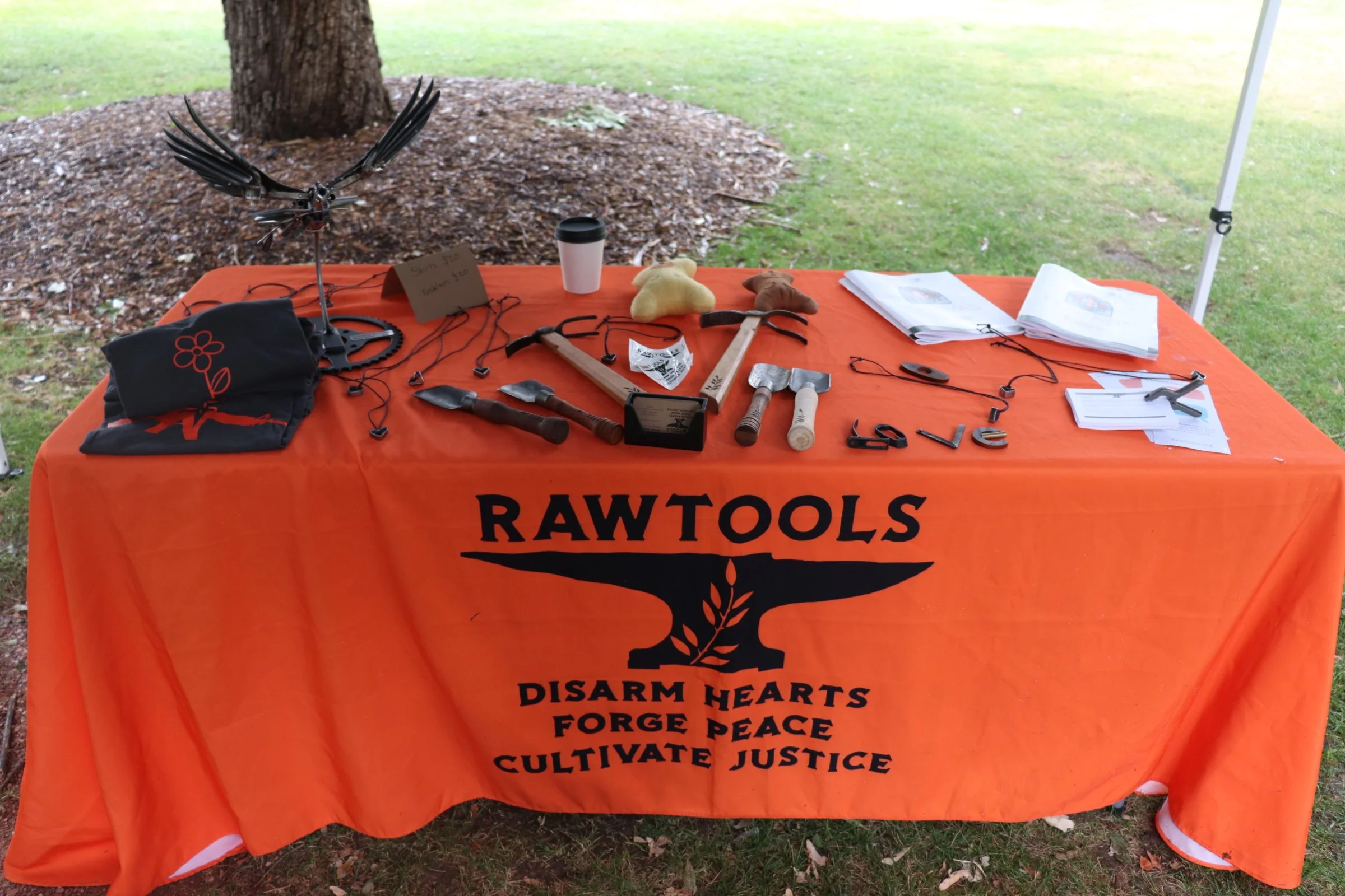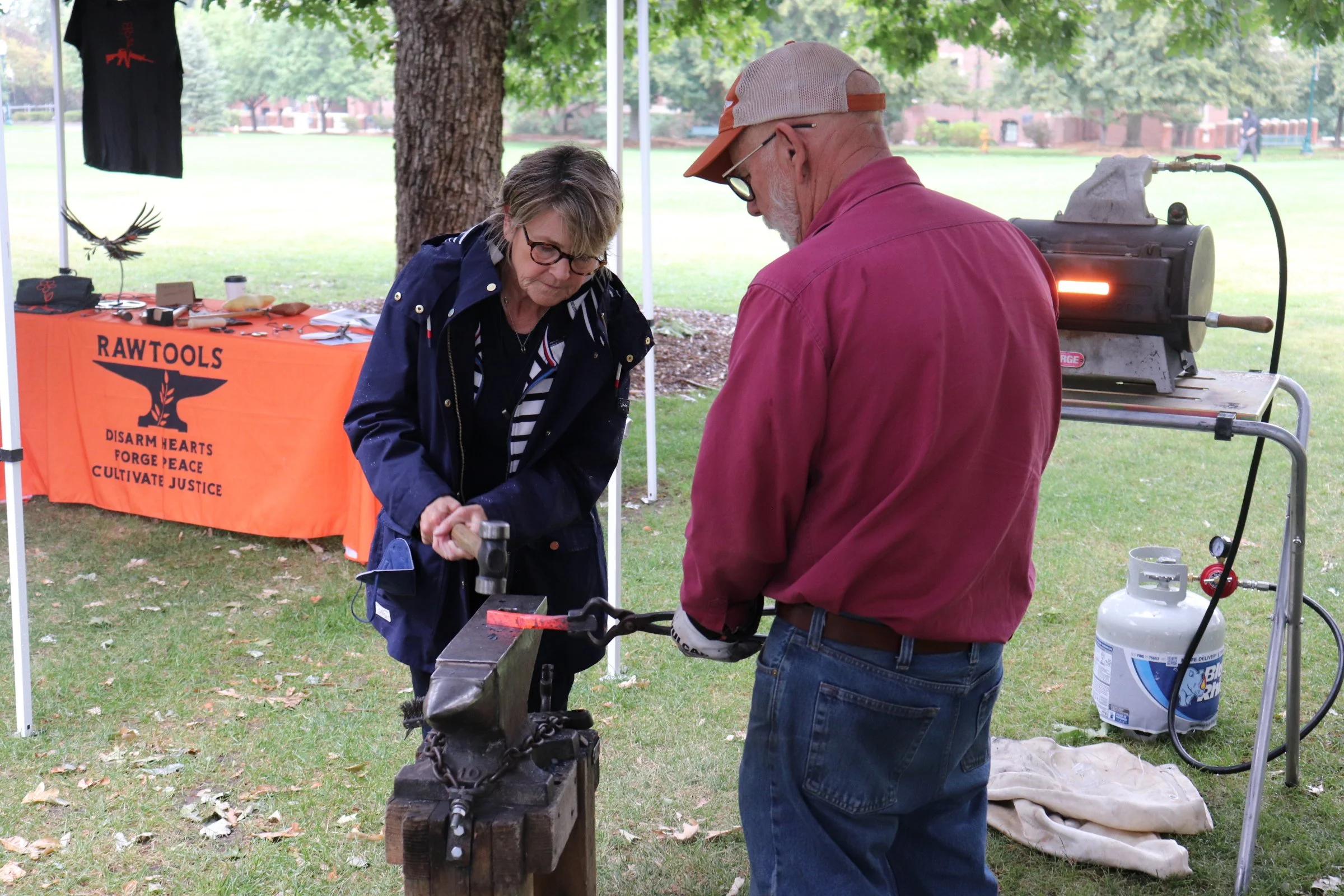 RAWtools, an organization that specializes in nonviolence training in real-world situations, attended First Year Experience events at Regis University. RAWtools made an appearance at Regis University giving students the chance to hammer a gun barrel in front of the Pedro Arrupe, S.J. statue in the morning and near food trucks in the afternoon.