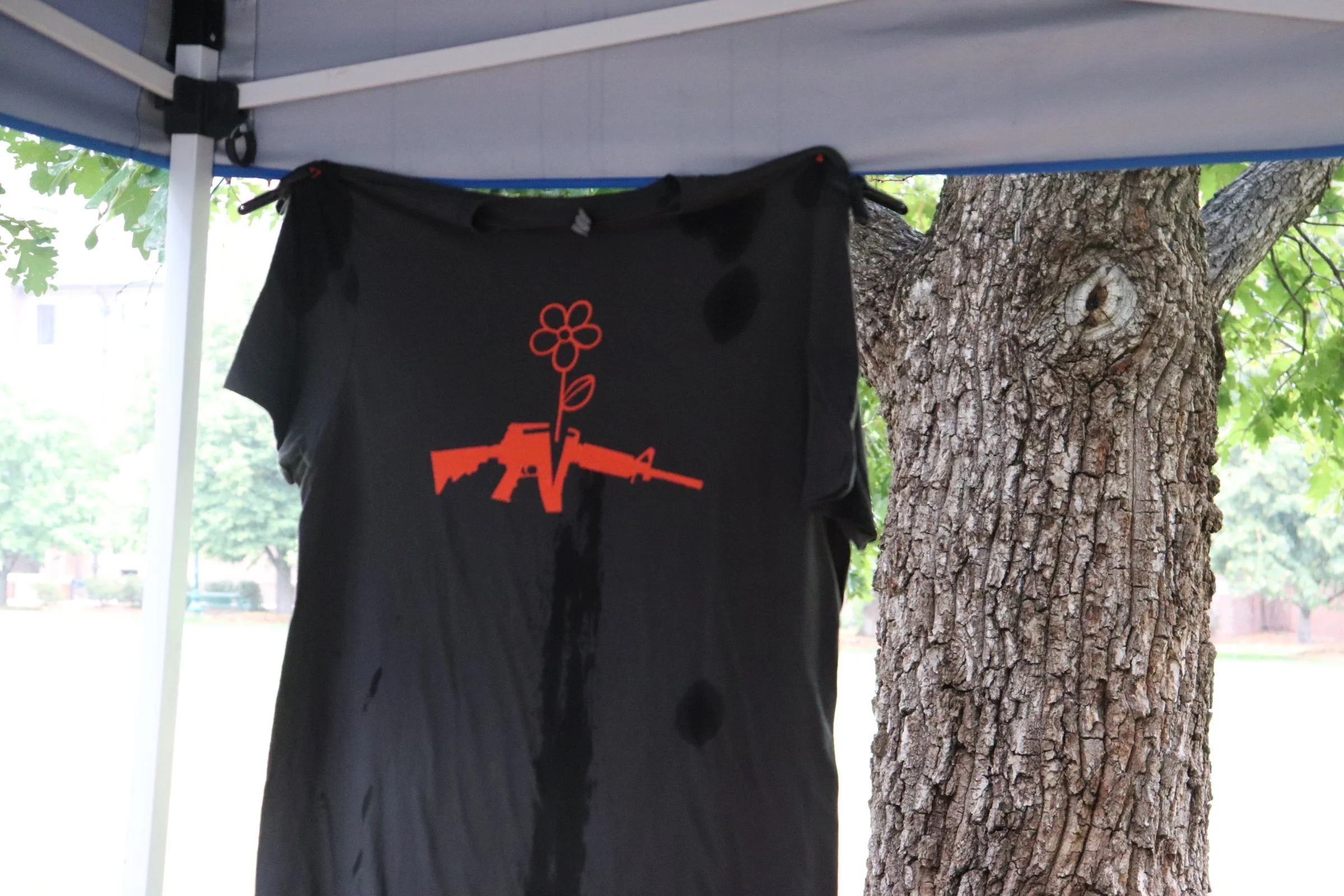 A RAWtools tee shirt proclaims the importance of peace in weapons. Photo by James Ortiz.