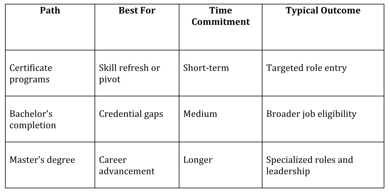 Different educational routes serve different goals. Looking at them side by side can clarify which aligns best with your situation.