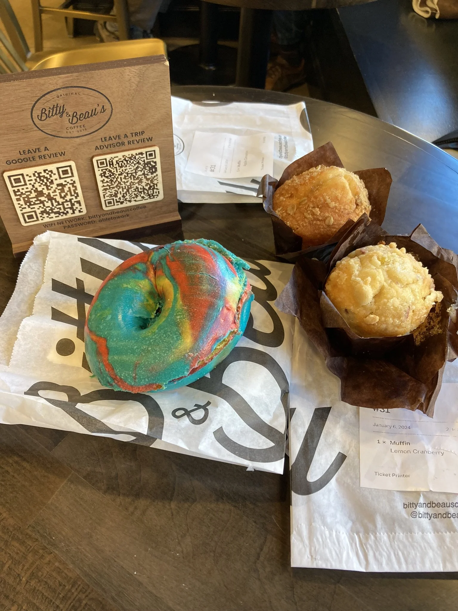 Obviously, Bitty and Beau’s is amazing in terms of social justice, but when you are looking for a coffee shop, you are typically more concerned with the coffee, the snacks, and the ambiance. However, I am happy to report that Bitty and Beau’s Coffee exceed expectations on all marks. They offer a wide variety of drinks for coffee lovers, coffee haters, and everyone in between. There are plenty of alternative plant-based and lactose-free milk options as well. They also have a wide variety of tasty snacks to choose from, including cinnamon rolls and a fabulous rainbow bagel.