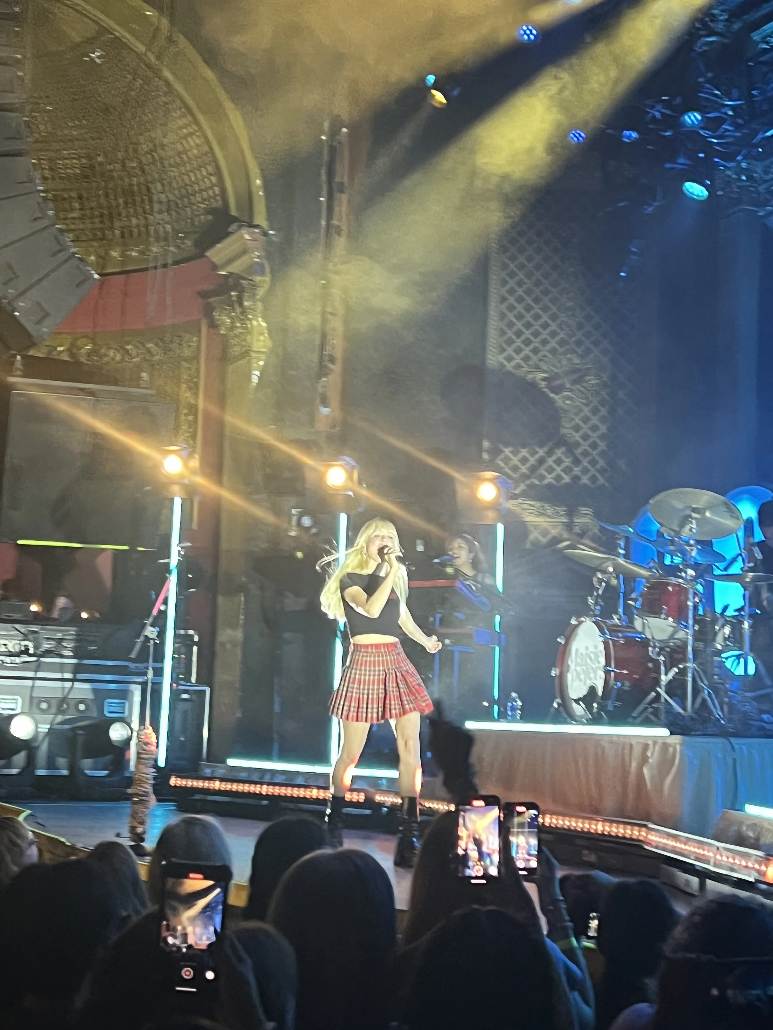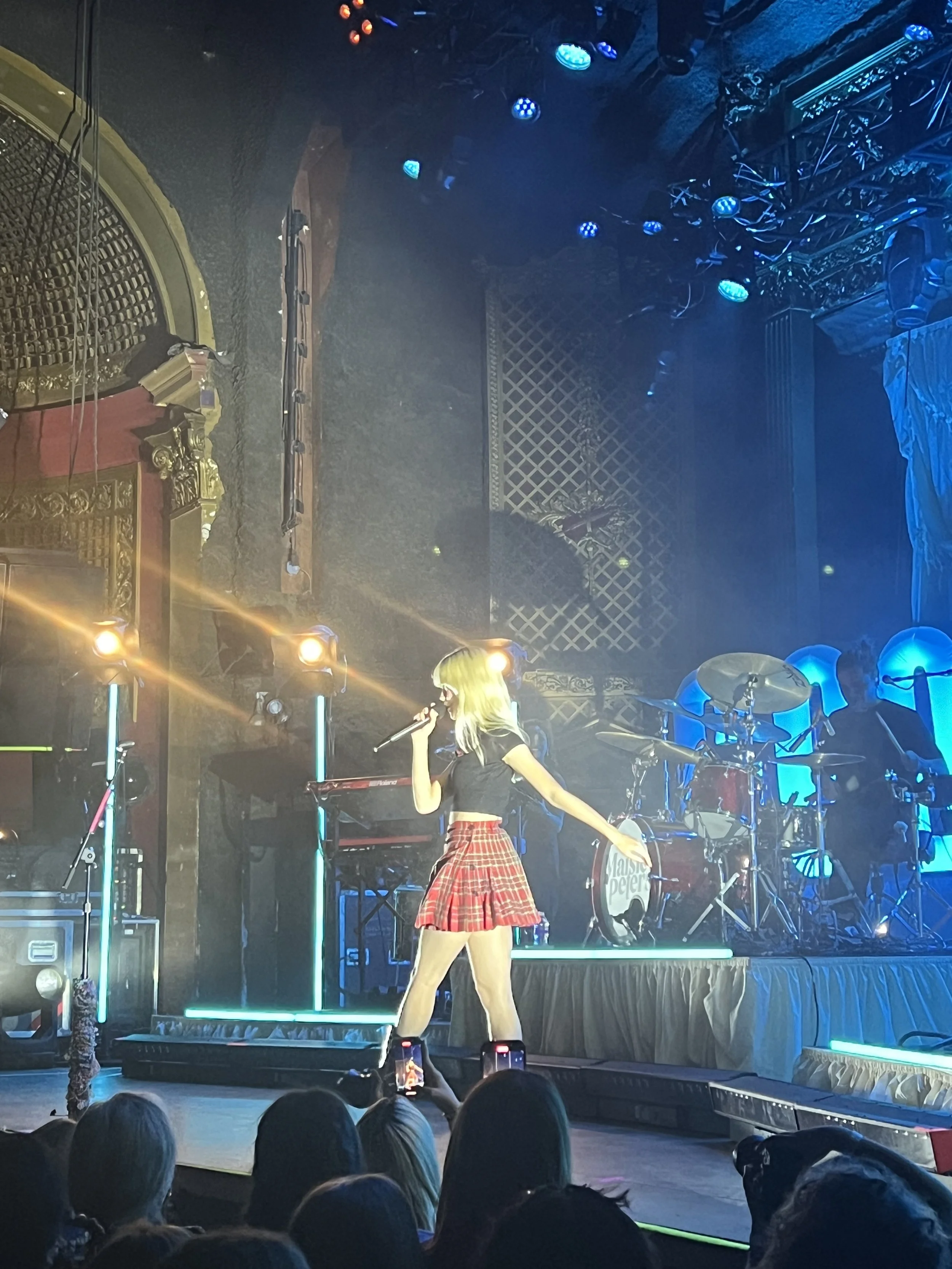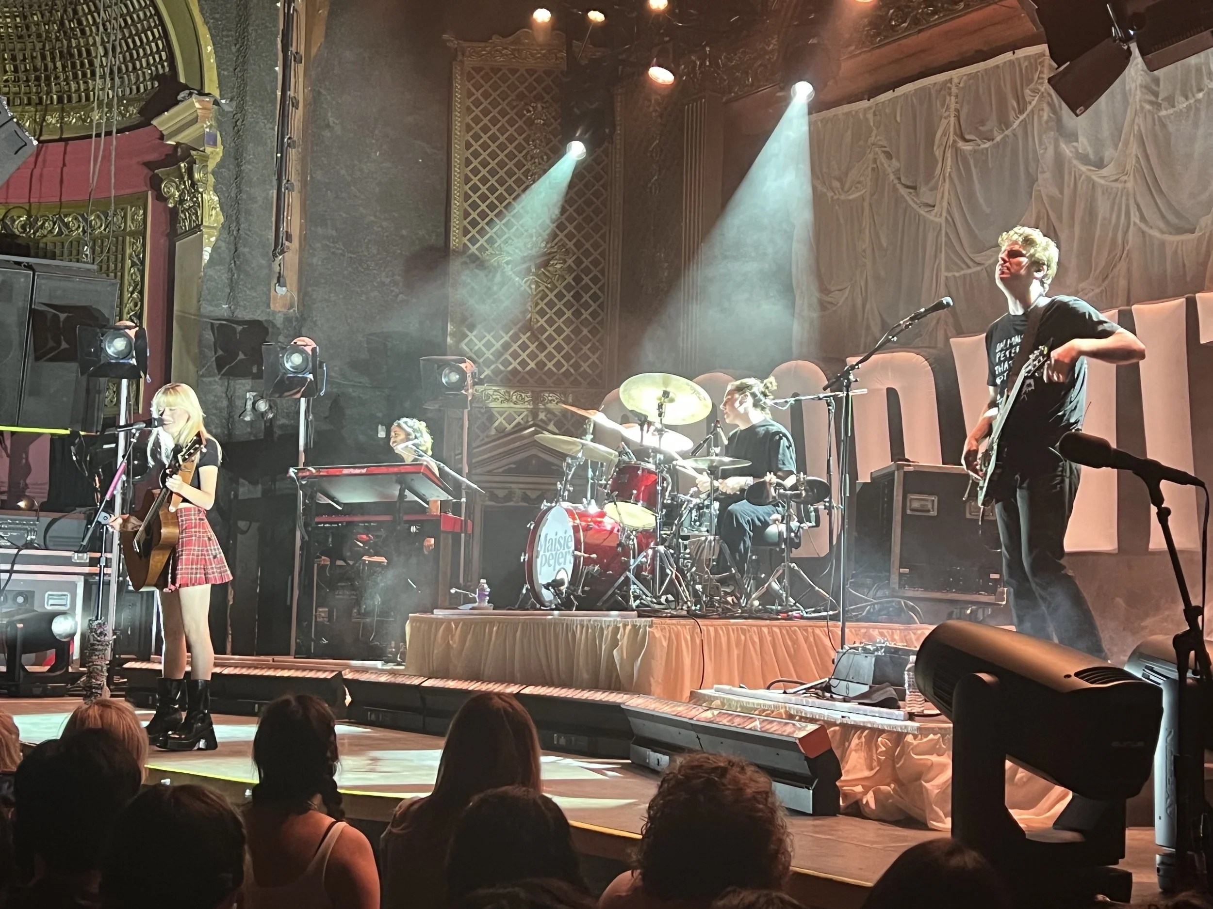 Maisie was accompanied by an intimate band of three artists. She proudly introduced each one of them with a fun fact and their history of working together, showing the closeness of the group and the tight bond they have formed throughout their two album tours. With Tina on the keyboard, Joe on the bass guitar, and Jack on the drums, Maisie valiantly and energetically led her team through the concert. Maisie switched between simply singing, playing an electric guitar, and playing an acoustic-electric guitar. Tina hit the high notes on a Roland electric keyboard with two levels, Joe blasted the speakers with a Fender Precision Bass, and Jack gave the heartbeat of the performance with a DW Performance Series 5-piece drum set with 3 surrounding cymbals, painted in scarlet red with Maisie Peters embossed on the front in bold, black ink.
